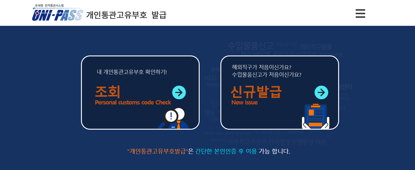 - 개인통관고유부호 메뉴 선택: 홈페이지에서 ‘개인통관고유부호 조회/발급’ 메뉴를 선택합니다.
