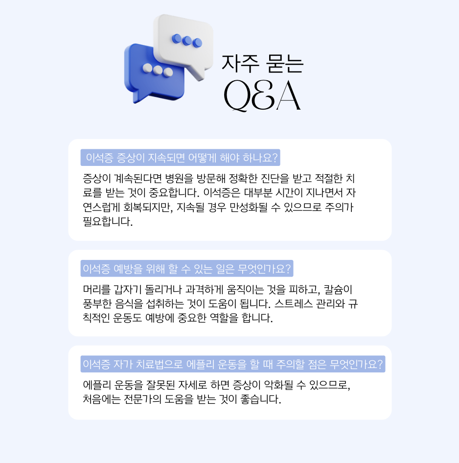이석증은 갑작스러운 어지럼증으로 일상에 큰 불편을 주는 질환이지만, 원인과 증상을 제대로 이해하고 적절한 치료를 받으면 충분히 관리할 수 있습니다. 어지럼증이 나타나 일상에 지장이 생긴다면, 이를 방치하지 말고 전문가의 도움을 받아 증상을 완화해 보세요. 건강한 귀 관리와 생활습관의 변화가 이석증 예방과 관리에 큰 도움이 될 것입니다.