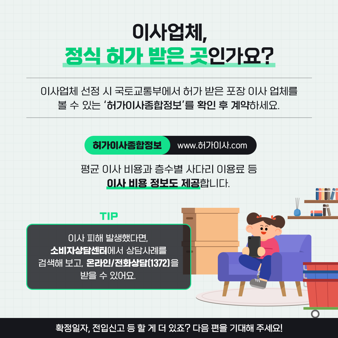 이사할 때 가장 중요한 것 중 하나가 믿을 만한 이사업체를 찾는 일입니다. 허가를 받은 정식 이사업체를 선택하면 물건이 손상될 걱정 없이 안심하고 이사를 맡길 수 있어요.