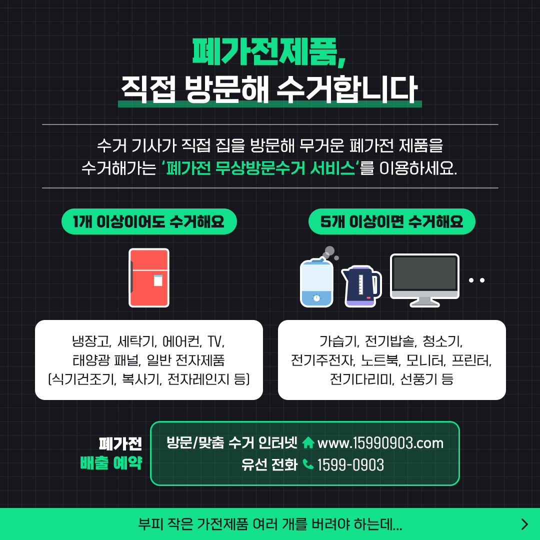 - 대형 폐가전 무상 수거: 냉장고, 세탁기, 에어컨, TV와 같은 대형 가전은 1개 이상이라도 무상으로 수거해 줍니다. 기사님이 직접 방문해주니 이동할 필요 없이 편하게 처리할 수 있어요.