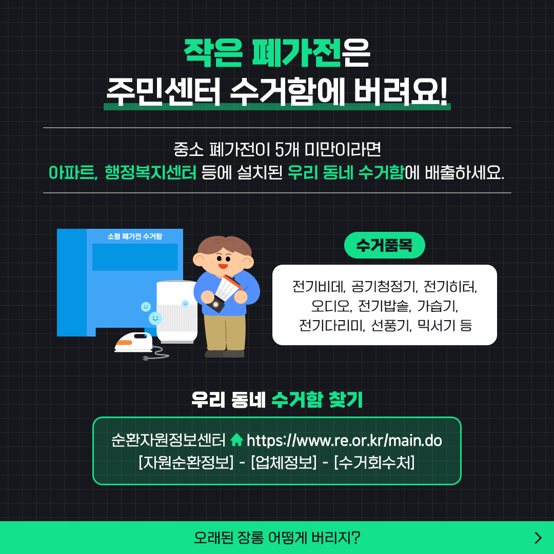 만약 5개 미만의 중소형 폐가전이라면 주민센터나 아파트 내 수거함에 버릴 수 있습니다. 가까운 행정복지센터에 수거함 위치를 문의해 보세요.
