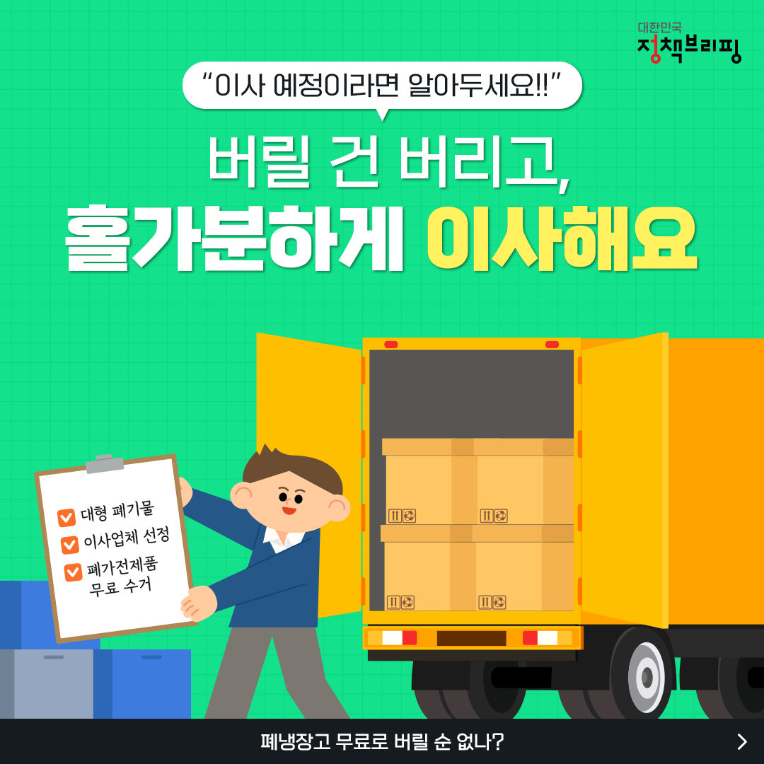 이사는 단순히 짐을 옮기는 게 아니라 불필요한 물건을 정리하고, 새로운 시작을 준비하는 과정입니다. 폐가전 무상 수거 서비스, 대형 폐기물 스티커 구매 등을 통해 깔끔하게 물건을 정리하고, 정식 허가를 받은 이사업체를 선택해 믿고 맡기세요.
