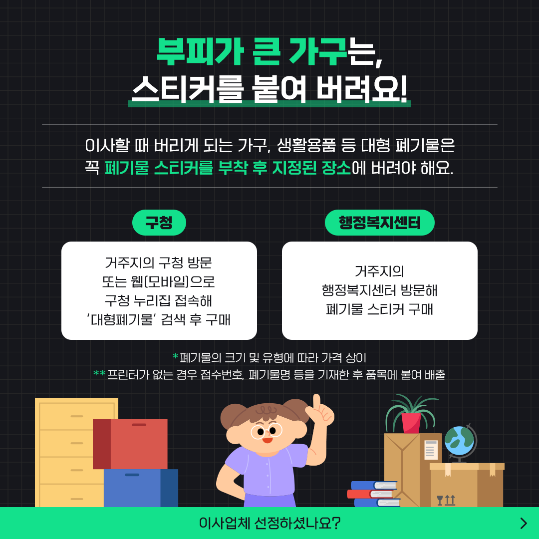 이사하기 전 꼭 처리하고 싶은 큰 가구나 생활용품이 있다면, 미리 폐기물 스티커를 구매해 정리하세요!
